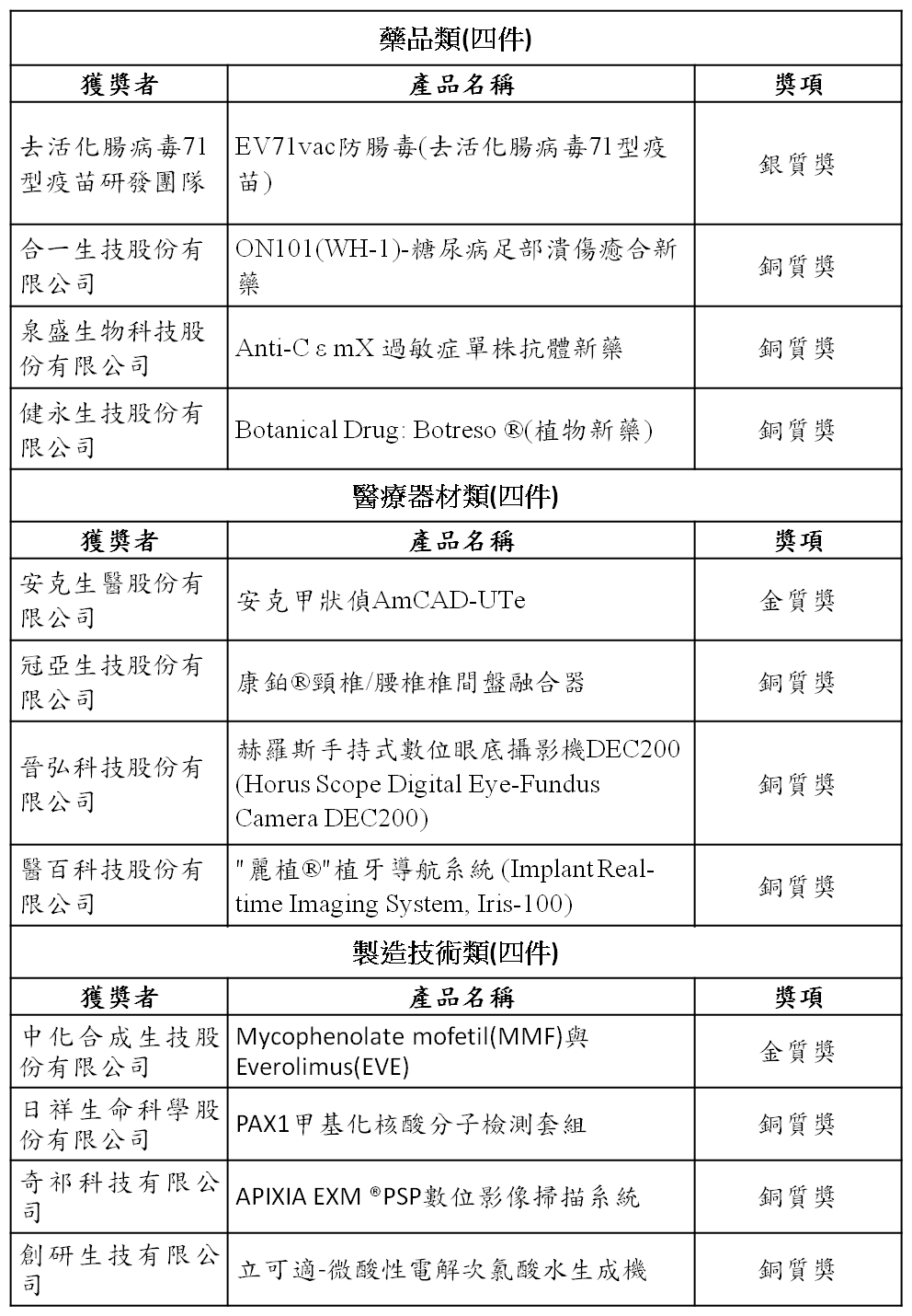 ※同等級獲獎者依申請者名稱筆畫排序。
