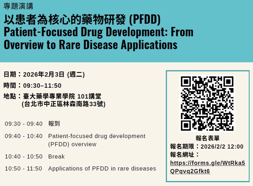 地點:臺大藥學專業學院101講堂(台北市中正區林森南路33號)