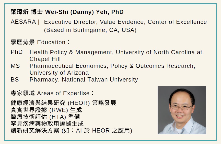 本次活動特別邀請 葉瑋炘 博士主講,博士長期專注健康經濟與結果研究策略發展、真實世界證據生成、醫療技術評估準備等,跨足藥學與實務決策經驗,將帶來具深度與前瞻性觀點,誠摯邀請您踴躍參與!